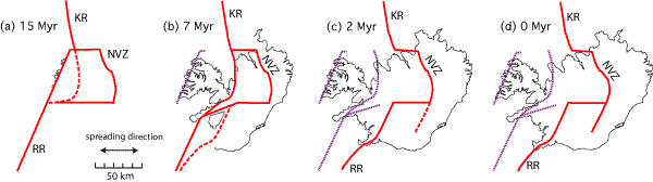 Iceland has been formed from volcanic rock, over the eons. This is not a violent birth, as the stretch zone just opens up, creating a crevasse. In the case of Iceland, which straddles the border of two large plates, the crevasse fills promptly with magma, which hardens. It does not split into pieces, it grows larger, thus. One can see this in the nature of the rock. Those nervous about this chasm should move away from the plate borders for the duration of the pole shift, moving back only after the magma has cooled.