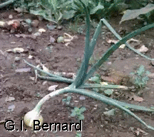 Prepare the bulbs for harvest when 50% of the onion tops have fallen over. Knock the rest of the tops over too, and the bulbs will form protective skins while the tops dry up. Do not water at this point. Bulbs can be pulled then and dried on the ground unless it is wet. Store in a hanging net is a cool cellar. Plant 1/4-1/2 deep, 2-3 apart, in rows 18 apart.
