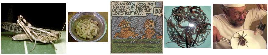 Eating Bugs is traditional and a normal part of the diet in many parts of the world, as they are full of proteins and fats and even Vitamin B. The Troubled Times Bug TOPIC has many suggestions. The Montegnards in Viet Nam roast crickets and include in rice meals. The Inuit in the Polar Circle eat white maggots grown in caribou carcases raw, and consider this a delicacy. Tie back the legs of tarantulas and toss them in the fire as they taste like crab. The Aboriginals mash ants with berries. Snails are an excellent food. The Bantu of Africa dry termites in the Sun and then roast in oil. In New Guinea grubs are roasted for their nutty taste. Earthworms can be minced and rinsed and added to soups or stews. Grasshoppers can be roasted on sticks for a quick snack. Even the Iowa State Entomology Department has recipies such as Banana Worm Bread, Rootworm Beetle Dip, Mealworm Fired Rice, and Corn Borer Muffins.