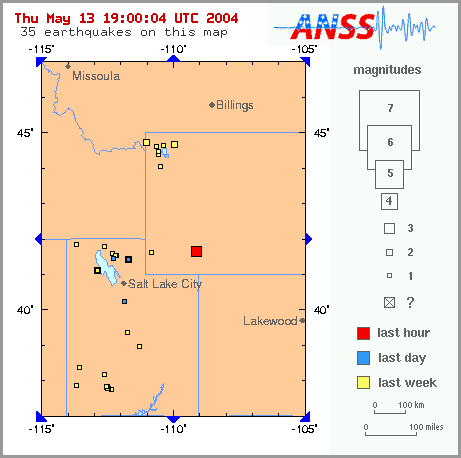 A minor earthquake occurred at 18:40:21 (UTC) on Thursday, May 13, 2004. The magnitude 3.2 event has been located in WYOMING. The hypocentral depth was poorly constrained. (This is a computer-generated message -- this event has not yet been reviewed by a seismologist.)