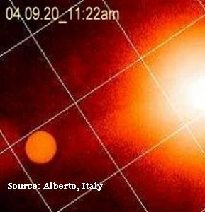 To the left of sun it is pretty apparent with red tail/dust to the left of it also. [and from another source] Photos taken at 5:10 PM Sep 21, 2004. The reverse of what is seen in the northern hemisphere, Planet X is now to the left in the afternoon, the reserse of what was seen last Mar 4, 2004.