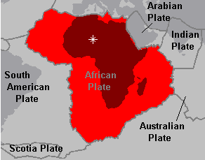The African plate is approximately 1/2 land mass with a divergent plate boundary on the west edge running up through the Red Sea. The center of the plate is on land mass, but not in a good location. The African plate turns at a very slow counter-clockwise direction causing a lot of earth quake and volcanic activity on the west coast of Africa. The center of the plate would be too close to this area.