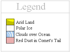 The tail of the comet is composed of lighter material toward the tip, as any heavier substances that far from the great comet's gravitational influence are drawn in other directions at one point or another. Thus, the gases and dust curl toward the Earth, and are first noticeable as a fine red iron dust, turning the water a bitter blood red. Does this dust not burn in the available oxygen, and end as so many tiny flying star specs? This dust, already oxygenated, does not burn. Its passage is swift, a matter of days, and the ending abrupt.