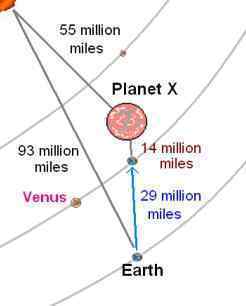 惑星Xは、黄道の上方に同時に上昇する間に、地球と自身の間の距離を詰め、2回目の270度の回転を開始する間に急速に移動します。 この角度で、惑星Xは、地球の上方を目指しています。 地球は、再び惑星Xの磁気の牽引に捉えられており、地球の公転軌道に沿って前方に引っ張られ、惑星Xに向かって僅かに動いていますが、この最接近における主要な存在は、とうとう自由に移動できると感じ、即座に移動する惑星Xです。 1400万マイルの地点は、惑星Xがまだ地球より太陽により近く、まだ地球の上方に上昇していて、地球の僅か右側にいる位置です。 32度の角度は、惑星Xがこの時点で地球を通過して移動して、この角度で2回目の270度の回転を完成するのを可能にします。