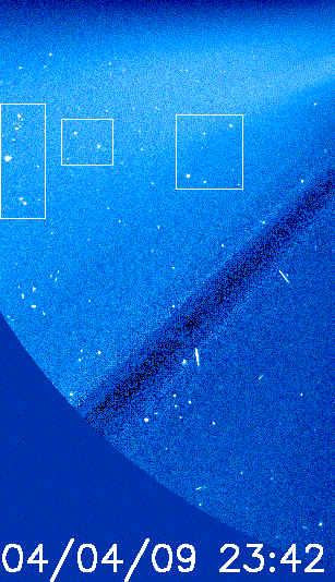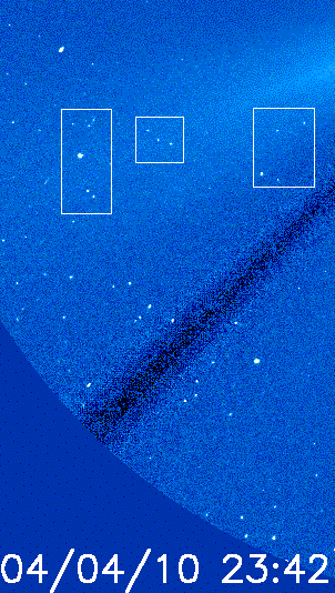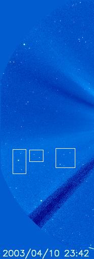 - #781ー時の合図 SOHOの詐欺、SOHOの写真の私の観察は、もし可能ならば、地球のポジションを知るためになされている。 SOHOはラグランジュL1のポイントのまわりの複雑な軌道を持っている、しかし地球に従わなければならない、太陽を越える背景は変わる。 私は、「1年の後のSOHOが、宇宙での同じ正確な位置を見ることができた」と考えづらいのを発見する。 私は2004年の4月9-15日の23時42分のイメージC3 Lascoの写真をプリントした、2003年4月9-10日の透明な紙も。 私はその時シートを重ねて、動きが、1日と他の日の間で、約1センチであるとわかることが出来る。 しかし、また、2003年4月10日と2004年4月9日の写真で同じ背景がある[これはうるう年のため、これが同じ日であー[2月29日]挿入されている](2ミリの違い)。 その時私が2004年4月9日と2004年4月10日のシートを重ねた:それらは似ているが、破砕物とノイズは、多く異なった、他の日の間に、それらは多く同様である。 私は4月9日までの写真が、保管書庫からの種類の写真であり、そして続く写真は、[現在、ライブである]別の種類の写真であると考えている。 しかし、不思議な物は、4月16日の写真である。 私達は、各日に水星を見ることが可能ではない間、彗星を見ることができる(私の年鑑SKYGLOBEが予想するように)。 しかし、たとえ、遠い星の背景が、正しく見えても [注:SOHOは地球の停止と軌道と★惑星Xコンポーネントと太陽の前の浮かぶチリと、2003年の秋に彼らが格闘した問題を変装させるため、彼らの保管庫からの挿入した写真を非難された