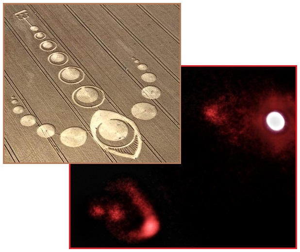 ZetaTalk Analysis 7/3/2004: What symbolism could the circle maker use to relay the thrumming struggle of this massive planetary magnet, 23 times the mass of Earth, as it attempts to punch through the crowded Ecliptic, facing a massive headwind but driven on its path by the Repulsion Force from the Sun. It presses forward but this creates additional crowding, so is driven back a bit, then another press forward. Is this not the annoying buzz of an insect? It is balance that is sought, in particle flows, and when entering a side of the Ecliptic where this particle crowding is absent, the Repulsion Force that has been pressing Planet X forward on its path has free reign. A sudden, and violent, exit from the solar system!