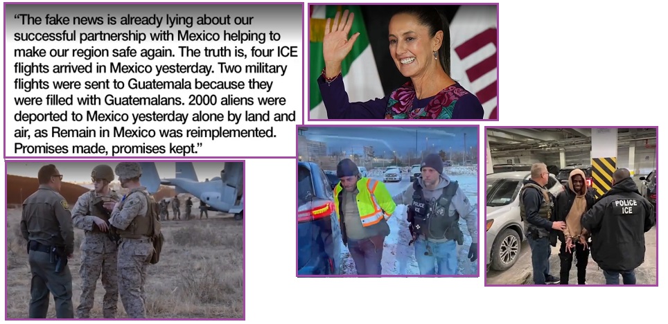 Colombia resisted accepting their deports, 160 of whom were arriving on US Military Planes, but after a trade and tariff war of words they caved to President Trump’s demands.  Mexico likewise cooperated with their Remain in Mexico agreement. By this Sunday January 25 Guatemala had repatriated 265 illegal aliens and Honduras had repatriated 193. Brazil sputtered about the disrespect shown to 88 repatriated Brazilians, who were shipped out in handcuffs. All this within the first week following President Trump’s inauguration.