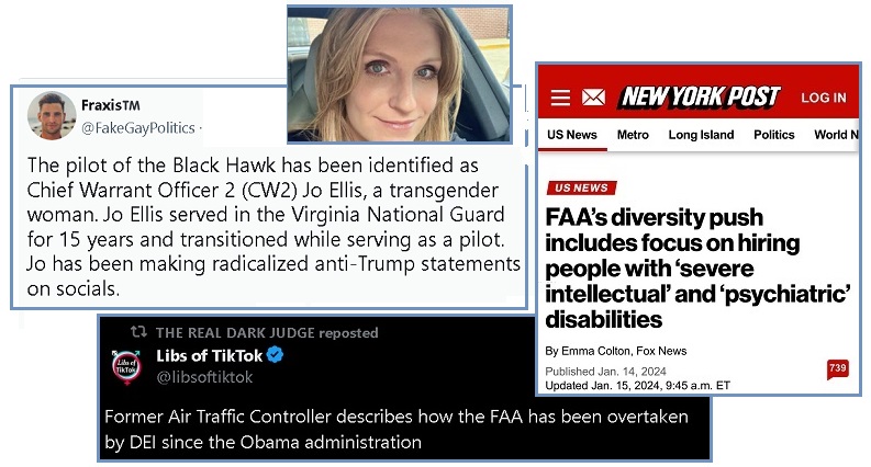 On January 29 there was a head-on crash between an American Airlines plane and a Blackhawk chopper on a training flight.  The investigation is complicated as the FAA control tower was understaffed at the time, one of the pilots of the chopper was a woman whose name was withheld for over a day after the crash, and the FAA was laden with DEI hires. CNN had advance warning that a crash was to occur, announcing it some 5 hours ahead of the crash. Was this an inside job, a false flag operation, a suicide/homicide rage by an angry DEI about to be fired, or simple negligence?