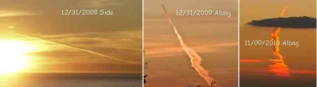 Does this "mystery launch" have something to do with NASA? Are they perhaps trying to sneak one past the alien visitors? [and from another] http://www.cnn.com/2010/US/11/09/california.contrails/index.html?hpt=Sbin The Pentagon is unable to explain images of what appears to be a high-altitude rocket or missile launched off the coast of southern California at sunset. The Pentagon and the North American Aerospace Defense Command were investigating video shot by a news helicopter operated by CNN affiliate KCBS/KCAL showing an ascending orange-colored contrail high into the atmosphere. The Federal Aviation Administration, the Coast Guard, Navy, Air Force, and California Reps. Dana Rohrabacher and Jane Harman -- whose coastal districts are closest to the offshore contrails -- were at a loss to explain the images. [and from another] http://contrailscience.com/a-problem-of-perspective-in-the-oc-new-years-eve-contrail/ An interesting contrail cropped up off the coast of San Clemente, Orange County, California on December 31st 2009. The curious shape led some people to think it's a missile launch, which it does kind of look like (all taken from San Clemente)