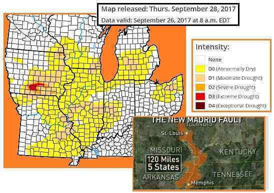 Mississippi River going dry above New Madrid Fault - Crack in ground? River gauges/pics show the Mighty Mississippi River going dry! New Madrid related? [and from another] https://youtu.be/EjwjUkoAxEM September 29, 2017: 130 mile stretch of the Mighty Mississippi River from Tennessee to NW Mississippi is completely dry in places, so low making it impossible for barge traffic to deliver grain to the International or National markets. [and from another] https://youtu.be/I_XWW9CNWMU October 1, 2017: Has a crack formed in the bottom of the Mississippi River leaking water down into the New Madrid Fault? The Mighty Mississippi is getting very low, even bone dry in some places. No drought. Where is the water going? [and from another] http://droughtmonitor.unl.edu/CurrentMap/StateDroughtMonitor.aspx?Midwest