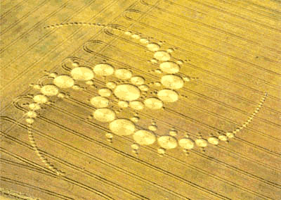 Helicopter blades can be heard pulsing as the chopper looks down through whispy clouds at a broad wheat field, golden in color. As the clouds part the crop circle laid into the wheat is exposed. The wheat has been bent at the nodes, not broken. Some grasshoppers are hopping across the bent wheat, trying to avoid the approach of the noisy chopper. A crop circle investigator is sitting next to the pilot of a helicopter. The investigator has a video camera up to his face, but has pulled this away from his face in order to speak. He has a distinct British clip. Through the chopper window the wisps of clouds are still clearing in the early morning light. The investigator says,