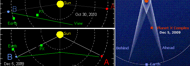 Когда нас спросили в декабре 2009 г., почему Планета X появилась на изображении Stereo Ahead, а на изображении Stereo Behind ее нет, мы заявили: "Поместите объект, расположенный примерно на половину пути между Землей и Солнцем, попавший в поле зрения коронографа Cor2, вперед (вправо), чтобы он появился на линии обзора в 4-часовом положении." Нэнси сделала это с более старой диаграммой, которую нашла на веб-сайте «Stereo», эта диаграмма все еще находится там. Поэтому она, не углубляясь в вопрос, поместила ПX на диаграмме там, где, как мы сказали, она будет, и как она должна быть видна относительно Земли, - в положении справа. Эта более старая и поэтому измененная диаграмма, казалось бы, должна также объяснить, почему Планета X появилась на изображении Stereo Ahead, а не на изображении Stereo Behind. Обратите внимание, что наши слова верны, - это важная вещь. На новой диаграмме Нэнси показывает правильное размещение спутников Stereo 5 декабря 2009 г., а также в их нынешнем положении. Эта диаграмма также показывает, почему тогда, 5 декабря 2009 г., Планета X была видна только на изображении Stereo Ahead. В 2009 г. для спутника Stereo Behind она терялась в ярком свете Солнца, но теперь отражает солнечный свет и для Stereo Ahead, и для Stereo Behind.