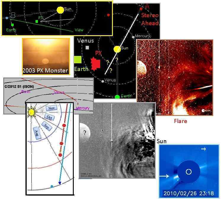 Нэнси попыталась нарисовать соответствующее расположение планет, которое более или менее корректно. Но то, что видно на изображении со Stereo Ahead, это ни что иное как гигантская персона самой Планеты X. Солнце находится справа, настолько близко к линии ее прямого наблюдения, что внизу изображения виднеется выброс корональной массы. Изображение является 2-мерным и, таким образом, по нему нельзя определить расстояние между объектами, если они не оказываются друг перед другом. Гигантская персона получается тогда, когда световые лучи распространяются во всех направлениях, но затем отклоняются обратно к гравитационному притяжению. Таким образом, они кажутся исходящими из внешних краев, но гигант не отображает истинный размер объекта. Редкая съемка Планеты X спутниками НАСА во время ажиотажа по поводу наблюдения ISON.