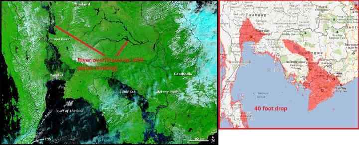 Наводнение внутренней территории на севере Таиланда произошло намного раньше какого-либо погружения в Бангкоке, так как блокирование внутренних рек было вызвано боковым разломом, испытываемым плитой Сунда. Давление на плиту Сунда не только заталкивает ее вниз, из-за чего она проскользнула под изгиб Индо-Австралийской платформы, который образовался под Суматрой и Явой, но и смещает в сторону, складывая в гармошку. Это стало очевидным, когда внутреннее наводнение в Таиланде началось в то же самое время, когда возле Бали появился новый остров.