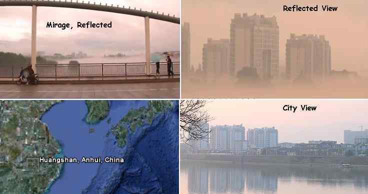 Это настоящий мираж, вызванный географическими особенностями Хуаншаня, который располагается в ущелье между горами и поэтому более теплый воздух проходит над холодной водой широкой реки. То, что может видеть наблюдатель из города, смотрящий через реку, перевернуто в отклоненных световых лучах, которые будут представлены наблюдателю на той же самой стороне реки в виде города. Как указывают жители, они видели это раньше, хотя в этом случае изображение было более крупное, поскольку разности температур теперь являются более резко выраженными из-за неустойчивой погоды.