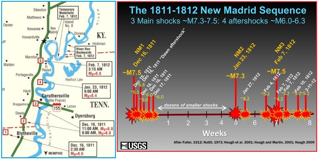 Ново-Мадридские Землетрясения 1811-12 годов https://www.britannica.com/event/New-Madrid-earthquakes-of-1811-1812 Подземные толчки ощущались на севере Канады и на юге, на побережье Мексиканского залива. Очевидцы отмечали, что от толчков звонили церковные колокола в Бостоне, штат Массачусетс, и рушились дымоходы в Цинциннати, штат Огайо. [и от другого] Резюме Последовательности Ново-Мадридских Землетрясений 1811-1812 годов https://www.usgs.gov/programs/earthquake-hazards/science/summary-1811-1812-new-madrid-earthquakes-sequence Они были самыми сильными к востоку от Скалистых гор в США и Канаде. Площадь сильного сотрясения, связанного с этими толчками, в два-три раза больше, чем при землетрясении на Аляске в 1964 году, и в 10 раз больше, чем при землетрясении в Сан-Франциско в 1906 году. [и от другого] Великое Землетрясение На Среднем Западе 1811 года https://www.smithsonianmag.com/science-nature/the-great-midwest-earthquake-of-1811-46342/ Команда Таттла раскопала горшечные черепки, острия копий и кукурузные зерна и поняла, что многим песчаным выбросам более 200 лет. "В некоторых из них были археологические памятники с артефактами 2000-летней давности", - говорит Таттл. "Не может быть, чтобы землетрясения в Новом Мадриде были одноразовой внезапной случайностью". Средний Запад подвергался сильным землетрясениям в 1450 г. н.э., 900 г. и 2350 г. до н.э. - и, вероятно, чаще. [и от другого] https://www.researchgate.net/figure/Map-showing-the-location-of-the-Isthmus-of-Tehuantepec-and-various-tectonic-elements_fig1_260725002