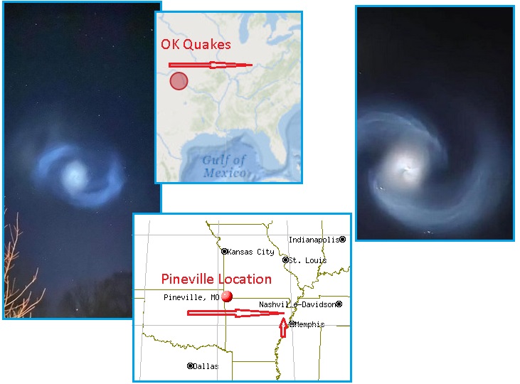 Если землетрясения в Оклахоме и Техасе указывают на то, что земля там сползает на Юго-Запад, то как это повлияет на твёрдые породы Озаркса? Мы подтвердили, что когда этот сдвиг на Юго-Запад раздвинет твёрдые породы по обе стороны от города Новый Мадрид, произойдёт разрыв линии Ново-Мадридского разлома. Тем временем в Озаркс происходит сжатие горных пород, что приводит к электронному визгу в породе. Этот визг привлекает любой заряд в атмосфере, который затем стремится к земле. Эта голубая спираль очень похожа на спираль в Норвегии в 2009 году.