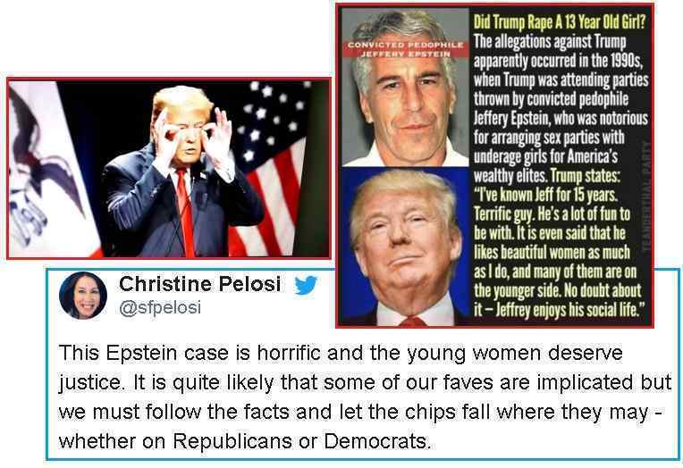 Клика отчаянно пытается скрыть отношения между Биллом Клинтоном и Эпштейном. Их связи с педофилами начинают появляться в прессе, от судебного преследования Nxivm и его отношений с демократическим кандидатом Гиллибрандом, чей отец был членом этого культа. Сжизания улик на острове Эпштейна будет недостаточно. Президент Трамп знал Эпштейна в обществе, так как они оба были миллиардерами в социальном круговороте Нью-Йорка. Но когда Трамп узнал о склонностях Эпштейна, он сразу же запретил ему посещать поле для гольфа в Мар-а-Лаго. Во время первого суда Эпштейна и соглашения о признании вины в 2007 году нынешний министр труда Трампа Акоста был прокурором, но подаст в отставку. Ничто из этого не отразится на президенте Трампе.
