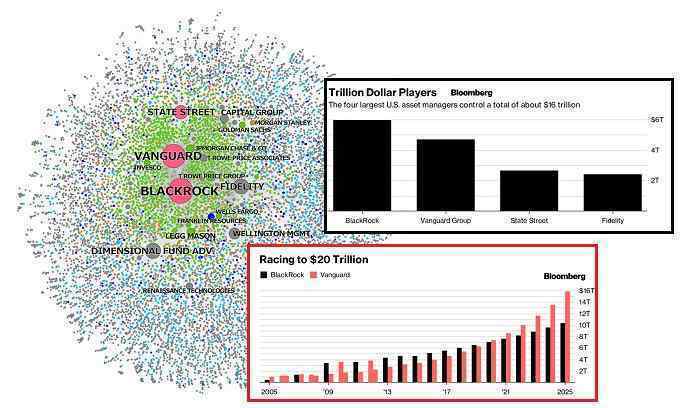 Мировая экономика становится монополистической. На вершине этой пирамиды находятся три компании, о которых вы ничего не слышали. Это BlackRock, Vanguard и State Street. До кризиса 2008 года никто о них ничего не слышал. Сегодня на финансовом рынке просто нет областей, в которые они не вовлечены. Большие технологические компании, крупные банки, нефтяные корпорации, СМИ и т.д. По правде говоря, это многое объясняет. Генеральный директор BlackRock Ларри Финк активно поддерживал демократов и даже пожертвовал деньги Хиллари Клинтон для президентской компании 2016 года. [и от другого] https://www.bloomberg.com/news/features/2017-12-04/blackrock-and-vanguard-s-20-trillion-future-is-closer-than-you-think Фирмы являются одними из крупнейших держателей акций некоторых из крупнейших в мире компаний в различных отраслях, в том числе в области технологий - Alphabet Inc., материнской компании Google, и Facebook Inc. [и от другого] https://www.dw.com/en/blackrock-the-secret-world-power/a-18653761-0 7 августа 2018 года. BlackRock: секретная мировая власть BlackRock консультирует центральные банки, финансовые министерства, крупных инвесторов, таких как государственные фонды, пенсионные фонды, страховые компании и фонды. [и от другого] https://theconversation.com/these-three-firms-own-corporate-america-77072 10 мая 2017 года. Эти три фирмы владеют корпоративной Америкой. Вместе BlackRock, Vanguard и State Street владеют активами почти на 11 триллионов долларов США. Это больше, чем все суверенные фонды благосостояния, вместе взятые, и в три раза больше, чем мировая индустрия хедж-фондов. BlackRock недавно утверждал, что юридически он не был «владельцем» принадлежащих ему акций, а скорее выступает в качестве своего рода хранителя для своих инвесторов. Большая Тройка осуществляет право голоса, закрепленное за этими акциями. Поэтому они должны восприниматься корпоративными руководителями как фактические владельцы. [и от другого] https://prospect.org/article/how-blackrock-rules-world 27 сентября 2018 года. Как BlackRock Управляет Миром. Не секрет, что генеральный директор BlackRock Ларри Финк создал теневое правительство из бывших чиновников агентств, чтобы стать министром финансов Хиллари Клинтон. Это не помешало Финку стать частью основной консультативной организации частного сектора для Дональда Трампа, пока эта группа не распалась после Шарлоттсвилля.