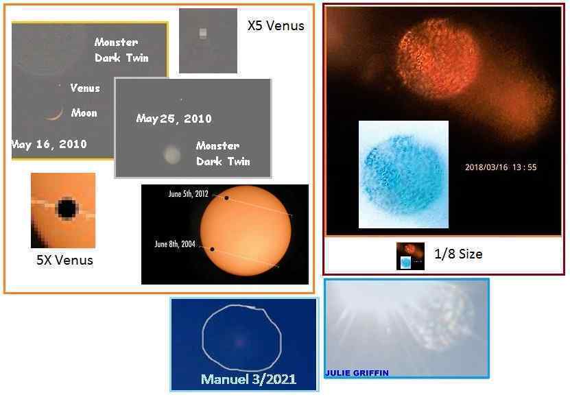 26 марта 2021 года. Хорошо, это было около 15:32, и мы видим 2 больших шара у Солнца, а затем вот то, что я считаю Нибиру в красном цвете и использую только камеру, и ни одного фильтра, и она выскакивает прямо на тебя. Смотря на запад, сильное колебание Земли поместило его туда, где она находится. Если Зеты захотят прокомментировать это, то было бы здорово. [и от другого] Анализ Нэнси: Я попыталась установить истинные размеры этого объекта, сравнивая с 8-кратным увеличением Альберто в 2018 г. (http://www.zetatalk.com/russia/issue599.htm) и сравнением с размерами Венеры, которые видны с Земли во время Транзита. Нибиру в 5 раз больше Земли в диаметре, а Земля и Венера имеют одинаковый размер. Поиск в Google, похоже, говорит о том, что 8-кратная камера означает, что фотографии имеют размер 12,5% истинного размера, если без увеличения. Таким образом, объект на фотографии Мануэля выглядит эквивалентным этим размерам. Крупный план Альберто 2018 года показал особенности на лице Нибиру, хотя и особенности в тяжелом бежевом облачном покрове, который не позволяет Аннунакам смотреть на звёзды, находясь дома на своей планете. Эти же особенности в облачном покрове появились в августе 2020 года в снимке Персоны Монстра от Julie (http://zetatalk.com/russia/issue724.htm). Фотография Мануэля сделана без увеличения, так что особенности не могут быть определены, но на теневой стороне объекта появляется определённое затемнение.