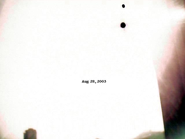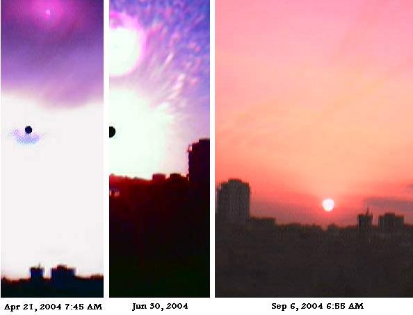 В разделе "Отражения" среди снимков я нашла вот этот, от 28 августа 2003 года. Сравнимая дата, и Солнце в сравнимом положении, хотя в 2004 это восход, а в 2003 - немного позже. Похоже, что восход в Италии не наступает ни раньше, ни позже, ни севернее, ни южнее, а наступает так, как ожидалось.