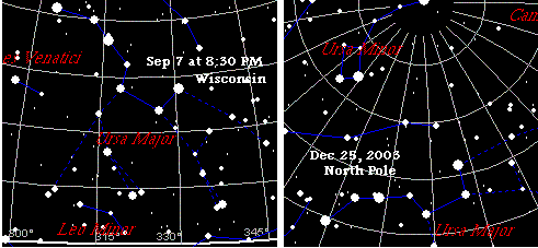 Обратите внимание, что видимое горизонтальное расположение Большой Медведицы соответствует положению Северного Полюса на 25 декабря 2003 г., а не расположению в 30°, ожидаемое програмой Skymap для 7 сентября в Висконсине, что в очередной раз демонстрирует, что расположение наблюдаемых созвездий соответствует наклоненной и приостановленной на орбите Земле