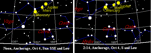 Это показывает, что на Аляске оно проходит по высокой дуге, и гораздо СЕВЕРНЕЕ. Оно наклонилось чересчур СЕВЕРНЕЕ положенного, что соответствует раскачиванию Земли, когда наклоненная Земля размещается так, что Солнце над центральной частью Тихого океана оказывается Севернее, как было отмечено ранее, 19 сентября, для Лагуны Скаммона.