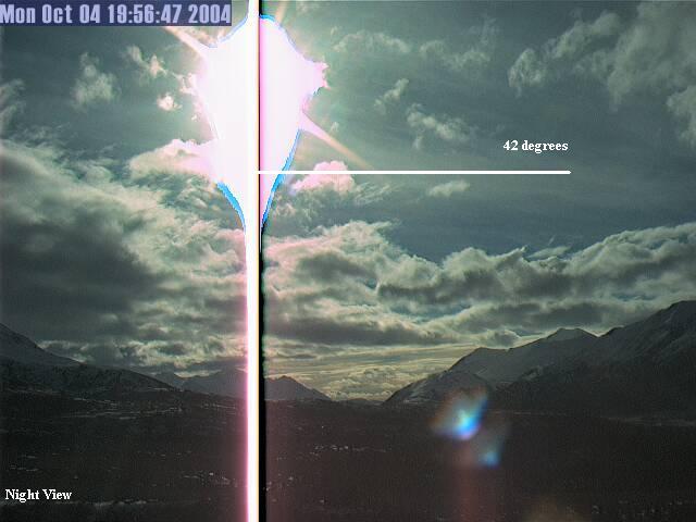 Блэк-Рэпидс (Black Rapids) находится на той же самой широте, что и Анкоридж, и, действительно, на веб-странице камеры указано, что 'Времена Изображений даны по UTC (универсальное время). Текущее время по UTC: (AKDT = UTC - 8) (AKST = UTC - 9)' (AKDT - летнее время Аляски, AKST - стандартное время Аляски). Таким образом, эти изображения сняты 4 октября, тогда, когда по AKDT в Анкоридже был полдень. Согласно программе Skymap, ожидалось, что в это время Солнце будет на юго-юго-востоке, на азимуте 150°, и на высоте всего 20°, и, таким образом, будет видно, и довольно высоко, на ЮЖНОМ виде. Камера СЕВЕРНОГО вида направлена в окно, которое, очевидно, отражает свет из окна, обращенного на Юг, что можно увидеть по изображению, снятому примерно 2 часами позже, в 14:14 по времени Аляски, где отражение сдвинулось восточнее. По этому движению можно оценить углы обзора камер, ведь по Skymap ожидался сдвиг на 42°, от азимута 150° до азимута 192°.