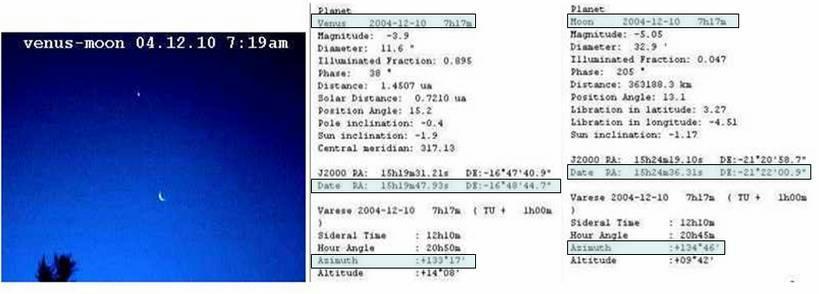 Этот снимок Венеры и Луны в очень красивом небе я сделал этим утром, в 7:17. Но, анализируя снимок, я обратил внимание, что Венера находится слева от Луны, а не справа. Невероятно!. В таком случае прямое восхождение (RA) Венеры должно быть больше прямого восхождения Луны. Чао.