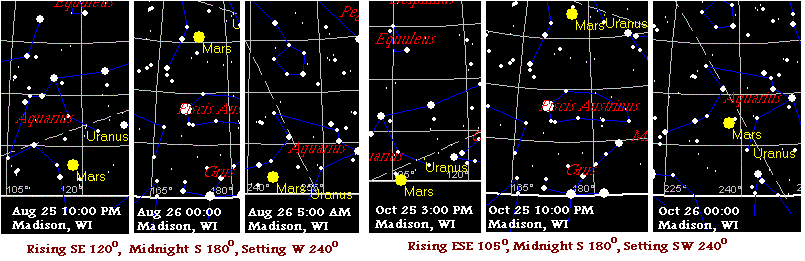 Примечание: сообщалось, что Марс ушел на ретроградную орбиту в конце июля - на месяц раньше. Здесь термин "ретроградная орбита" означает, что это только кажется, что он движется в обратную сторону, а Земля его обгоняет, так что он должен быть позади, а не впереди Земли, когда они оба движутся по своим орбитам. Для того, чтобы это произошло на целый месяц раньше, или для того, чтобы орбита Марса была близка к той, что была в августе, по замерам времени, это должно означать, что и Земля, и Марс застыли на своих орбитах, не продвигаются с конца лета. Согласно программе Skymap, Марс должен восходить на 5 или более часов раньше и заходить намного позже - значительная разница.