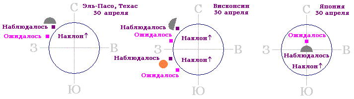 30 марта: Этим утром, в понедельник, в 01:00 Луна была на азимуте 315° и высоте 20°. Я подождал, пока она не спустилась низко над горизонтом, чтобы более точно измерить угол наклона освещенной части на области Луны, обращенной к Солнцу. Наклон был 40°. Когда я триангулировал его с уровнем горизонта в качестве гипотенузы, углы были 40°, 90° и 50°. Это значит, что Солнце было бы, если бы я его мог видеть, на 360°. Почти над Северным полюсом или далеко на севере. Согласно программе Skymap, азимут должен быть 285°, а высота - 30°. Снова положение эклиптики, выданное программой Skymap, отличается на 30°!