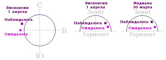30 марта: Здесь, в северо-западной Индиане, во вторник я вышел примерно в 7:30 утра и заметил, что Солнце было очень высоко в небе для этого времени дня. Если учесть, что восход - примерно в 6:00 утра, а Солнце должно быть выше всего в 12:00 (в полдень), то на полпути к этой точке оно должно быть в 9:00. Ну вот, а во вторник я вышел в 7:30 утра и заметил, что Солнце было больше, чем на полпути к высшей точке - там, где оно обычно должно быть в 9:30 утра. Согласно программе Skymap, ожидалась высота 19°, а не 50°.
