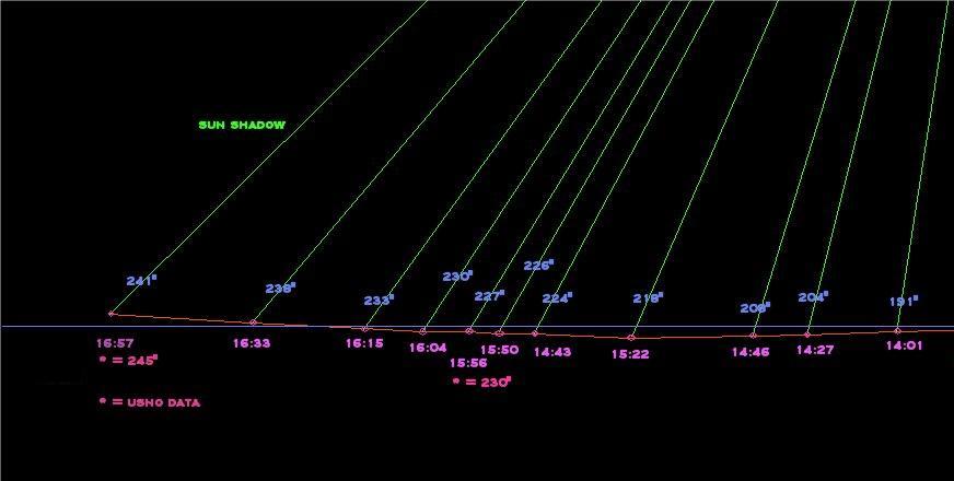 Здесь составили диаграмму более ВЫСОКОЙ дуги прохождения Солнца с отмеченной на ней точкой его НАИБОЛЬШЕЙ ВЫСОТЫ. Она оказалась не точно в полдень! На этой диаграмме время дня - розовое. Солнце прослежено с востока (справа) на запад (слева), где положение на горизонте - синее, 90° - направление на восток, 270° - на запапд, а 180° - точно на юг. На этой диаграмме дуга Солнца на небе была начерчена перевернутой, а эта красная линия показывает, что Солнце ВЫШЕ ВСЕГО в 15:22, а не в 13:26 в полдень, как ожидалось. Это также может быть видно по зеленому углу Солнца, начиная с 3+ часов от ожидаемого полудня в 13:26 - с 10:15, где этот угол равен 45°, и до 3+ часов, до 16:57, где он опять равен 45°, что указывает на то, что Земля вращается с востока на запад с такой средней точкой, что и ожидалась, но Солнце после полудня находится ВЫШЕ в небе! В то время как более высокая дуга - вследствие наклона Северного полюса в сторону Солнца, эта более поздняя высшая точка - вследствие СКЛОНЕНИЯ Земли в сторону Планеты Х.