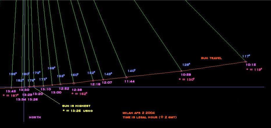 2 апреля: бесспорное свидетельство затруднений во вращении Земли. Положение Солнца в течение 6 часов до и после полудня в Милане, Италия. Полдень, согласно сайту USNO - в 13:26. Программа Skymap ожидает, что Солнце должно быть на азимуте 180° в 13:26 по летнему времени, с высшей точкой на высоте 50°, так как перемещение во времени вперед или назад большей высоты не дает.