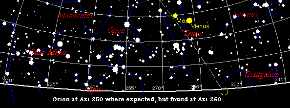 увидеть, что Орион находится на 260 градусах