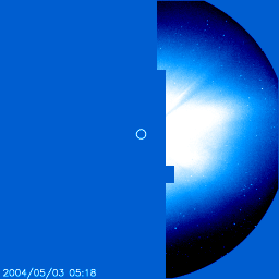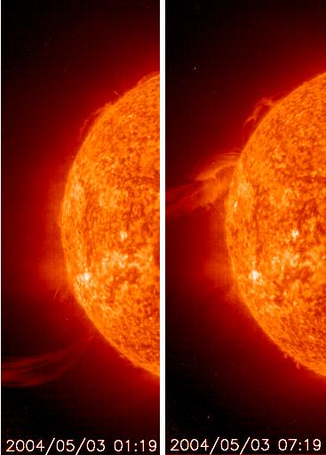 Посмотрите на этот снимок Солнца с SOHO (справа) в 01:19, а потом на следующий, через 6 часов, в 07:19.