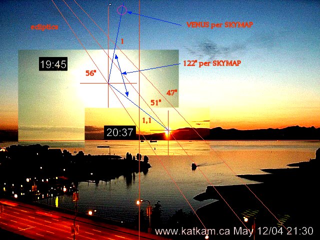 - Я сделал точные измерения снимков камеры Katkam. Сначала я подогнал положение, испольюхзуя дерево как точку отсчета, затем начертил эклиптику (как SKYMAP). И наконец я провел угол между солнцем в 2 часа и Венерой. Согласно программе Skymap, он был 122 градуса, и вы можете видеть разницу. Но есть еще одна вещь: Венера на эклиптике располагается неправильно, так что положение Земли неправильно, а на другом снимке (в 21:30), думаю, что небо не такое, как на моем предыдущем снимке, а то, что было по крайней мере месяц назад (или 2).