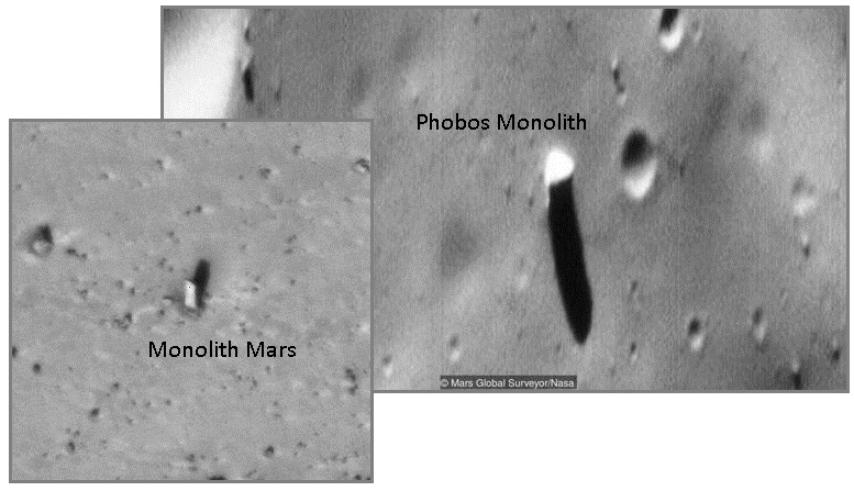 - 12 июля 1988 г. СССР отправил к Марсу две автоматические межпланетные станции (АМС) – "Фобос-1" и "Фобос-2". На последнем снимке, полученном с "Фобос-2", был запечатлен гигантский космический корабль цилиндрической формы – огромный, сигарообразный 'корабль-носитель', длиной примерно 20 км и до 1,5 км в диаметре. Он завис или находился на стоянке рядом с марсианским спутником Фобос и был сфотографирован 25 марта 1989 г. советской беспилотной станцией "Фобос-2". После того, как этот последний кадр была передан по радиосигналу обратно на Землю, зонд таинственно исчез; по мнению русских, он был уничтожен – возможно, сбит импульсом энергетического луча.