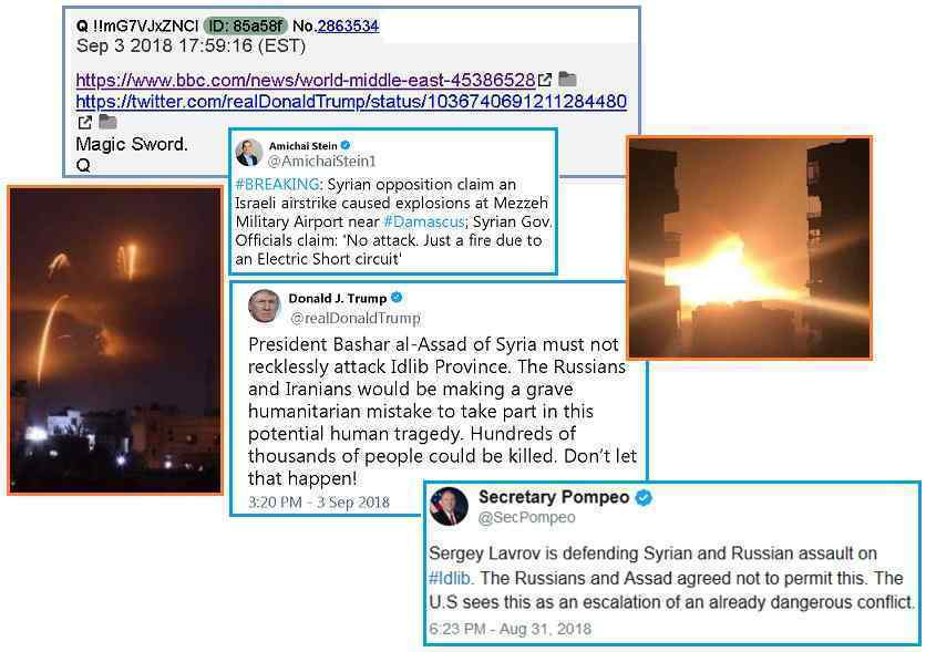 Но в Сирии его приятели среди сирийских повстанцев и остатков ИГИЛ были расстроены. Они планировали устроить праздник, но их подарки к вечеринке – склад оружия в Идлибе под Дамаском, был взорван 01 сентября в выходные перед днем памяти в США. Кто это мог сделать? Конечно, русские не хотели свержения Асада, а США не хотели разжигать пожар войны в Сирии, и еще нельзя было исключать всегда нервный Израиль. Но, согласно загадочному инсайдеру Q, это было сделано с помощью "волшебного меча".