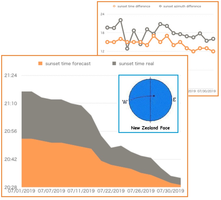Shift ning о местоположении восхода и заката солнца, а также фиксирует их время. Она определяет Азимут и сравнивает его с тем, что ожидается в соответствии с астрономическими моделями. То же самое она делает со временем восхода или заката солнца, сравнивая его с данными официальных сайтов. Ее июльские диаграммы показывают, что к концу месяца восход Солнца постоянно опаздывал