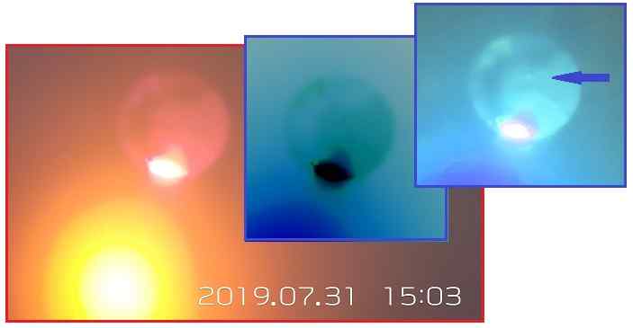 31/08/2019: Альберто отмечает, что его телескопический объектив масштабирует так, что то, что появляется в кругах, находится в фокусе его объектива. Он ищет яркий объект вокруг Солнца, а затем целится в него. Единственный самосветящийся объект, находящийся так близко к Солнцу, - это Нибиру, которая в последнее время испытывала сильное колебание слева направо. Почему край освещённого и увеличенного круга показывает вспышку света, как если бы круг имел твёрдые края? Многие Лунные Вереницы, находящиеся в окрестностях Нибиру, отражают свет Солнца, но это не очевидно вне области зрения телескопическоого объектива.