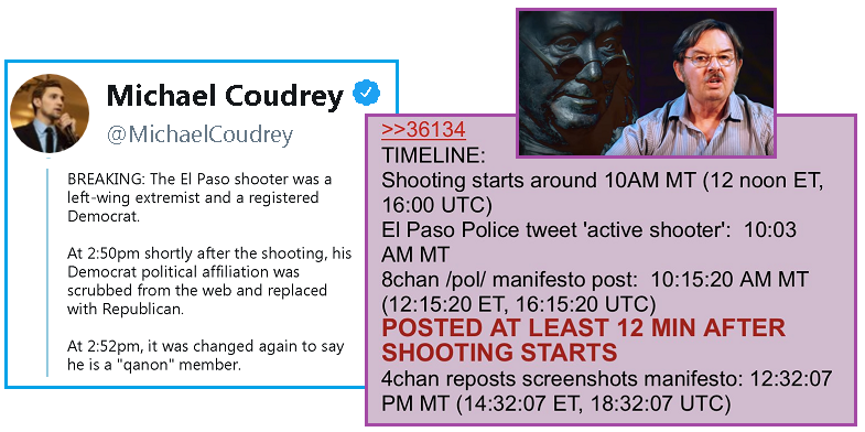 публиковал свой "манифест" форуме 8Chan, поскольку это также было сделано после стрельбы (кем-то). Кроме того, СМИ не могут подтвердить, что “Манифест” был написан стрелком из Эль-Пасо, поэтому они не решаются заявить об этом. Независимо от того, что стрелок из Эль-Пасо разделял идею Трампа по поводу пограничной стены, он был демократом, как и