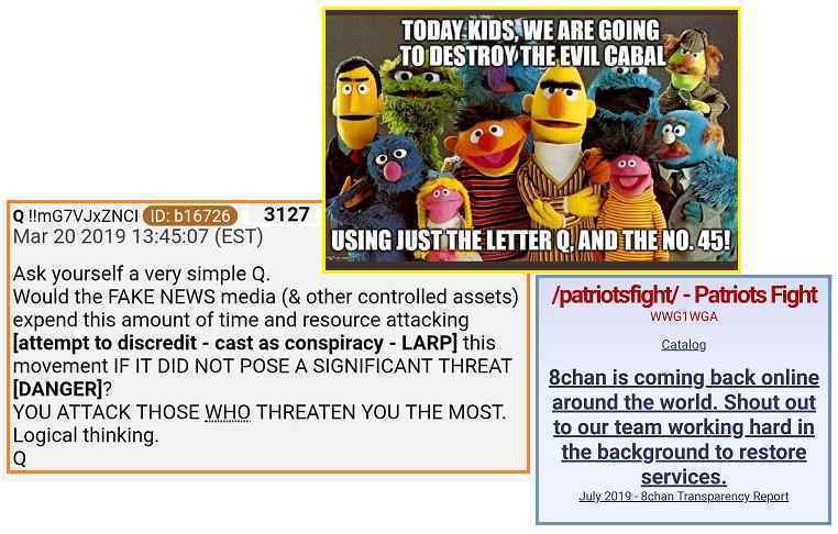 31/08/2019: Вопреки тому, что говорят контролируемые СМИ и контролируемая демократами Палата представителей, дискуссионные форумы Q не умерли и не несут ответственности за массовые убийства, вдохновлённые Кликой в Новой Зеландии, Гилрое, Эль-Пасо или Дейтоне. Доказательства, с помощью которых пытаются связать 8Chan с этими убийствами, были созданы Кликой намеренно в попытке стереть правду. 8Chan пытаются дискредитировать в попытке дискредитировать Q. Как и в Министерстве Правды 1984 (отсылка к роману Оруэлла - прим. перев.), Клика и её союзники в Государстве в государстве проповедуют ложь как истину и называют правду ложью.