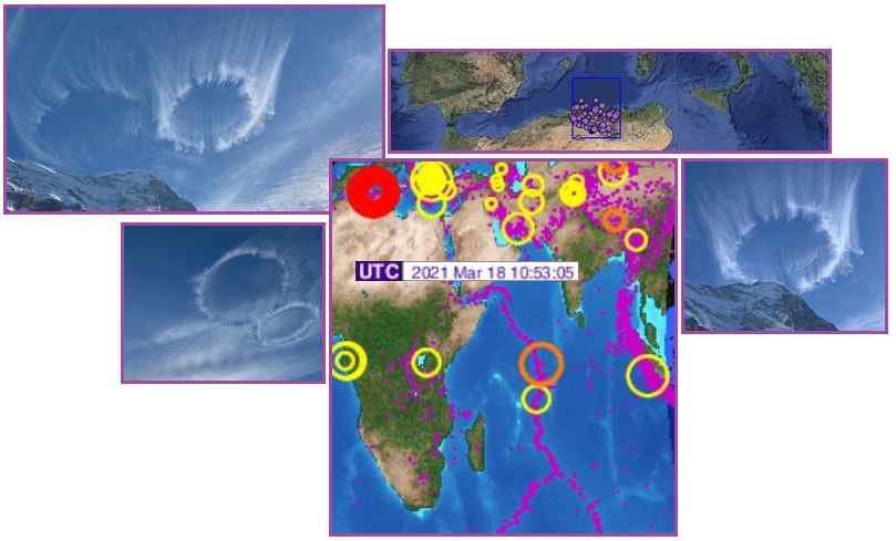 Очевидно, что Евразийская плита растягивается выше Средиземного моря, при этом верхняя часть Африканской плиты заталкивается под Грецию, и теперь граница к востоку от Гибралтара подталкивается к разрыву. Африканская Плита должна для этого просесть, чтобы у нее было место для разворота, и это проседание начнётся в ближайшее время. Тем временем, точки давления приводят к образованию того, что называется облаками землетрясения, исчерченным линиями небе, отражающими вспучившиеся выбросы от породы внизу. Преобладающие западные ветры и Струйный поток подталкивают эти выбросы, а полосатые облака поднимаются над Альпами.