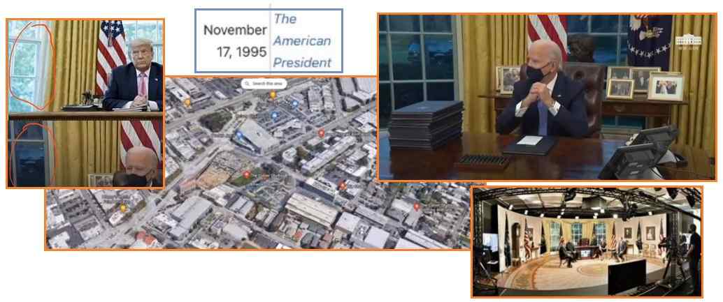 Но одной из самых первых подсказок был интерьер “Овального кабинета”, где находился “президент” Байден, в то время как сцены за окнами явно были фоном