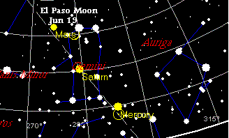 В субботу, 19 июня, когда я здесь, в Эль-Пасо, вечером вернулся домой из магазина, то на вечернем небе увидел Луну (ее тонкий серп). Она была на высоте 30° и азимуте 310°. Это намного севернее.
