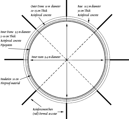 This inner room, in this picture, is about 9.4 meters in diameter and 4.4 meters in height. The roof is of course sloping downwards on the sides. You can have two floors. Windows and doors are the weak points in this structure but can be made safe with reinforced iron doors bolted on the inside and outside. The Base, 30 cm thick and 10.5 meters in diameter, is also reinforced concrete and one could use reinforced iron bars (or old rail bars) formed as a star from the center of the Dome Base. The far end of the bars could then be bent down into the earth (30 cm). This should make it a stable base.