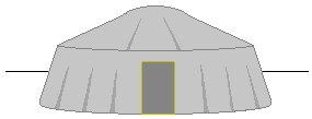 [1] The whole shelter is carried on one or two camels. It can be erected by several people in a half hour. After the outside covering is tied on and door shut, it is astoundingly solid and sedentary looking. The yurt is always pitched facing south, so the pool of sunlight shining through the smoke hole in the roof acts as a clock.