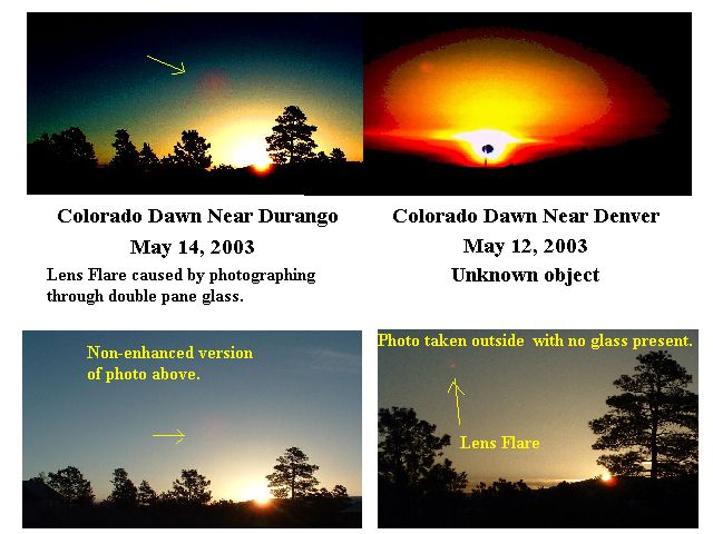 As a courtesy, I wanted to see if I could duplicate the May 12th Colorado dawn photo. I took a series of photos at the same time from my area in Colorado this day, May 14th. I saw nothing visually. The photos were taken both inside and outside over a period of about 20 minutes. Once displayed from the digital camera an object appears at the same angle as the May 12th photo. The outside shots are abvious lens flares as they have indistinct rainbow-like shapes and color. The shot taken inside through a double pane glass window however had a rather dramatic effect. A circular redish flare in the same position. There is a qualitative diference from the May 12th photo but I wonder if the photographer in Denver also took a photo through a glass window, perhaps single pane glass. I still do not know if Planet X is there or not but an open mind will investigate all data posibilities no matter where they might lead. I hope this comparison will assist others in determining what they see.