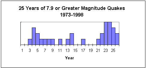 The NEIC (National Earthquake Information Center) of the USGS reports earthquakes, by year, with magnitude. These statistics shows an increase in magnitude 7.9 or greater, the magnitude used as a threshold by Troubled Times on their Quake Watch pages. A magnitude of 7.9 was used as the threshold as it was noted that the USGS downgraded quake magnitude slightly, from the magnitude originally reported in the news. Since 8.0 is used by the USGS to include a quake in their "major" quake category, including 7.9 avoids any statistical manipulation.